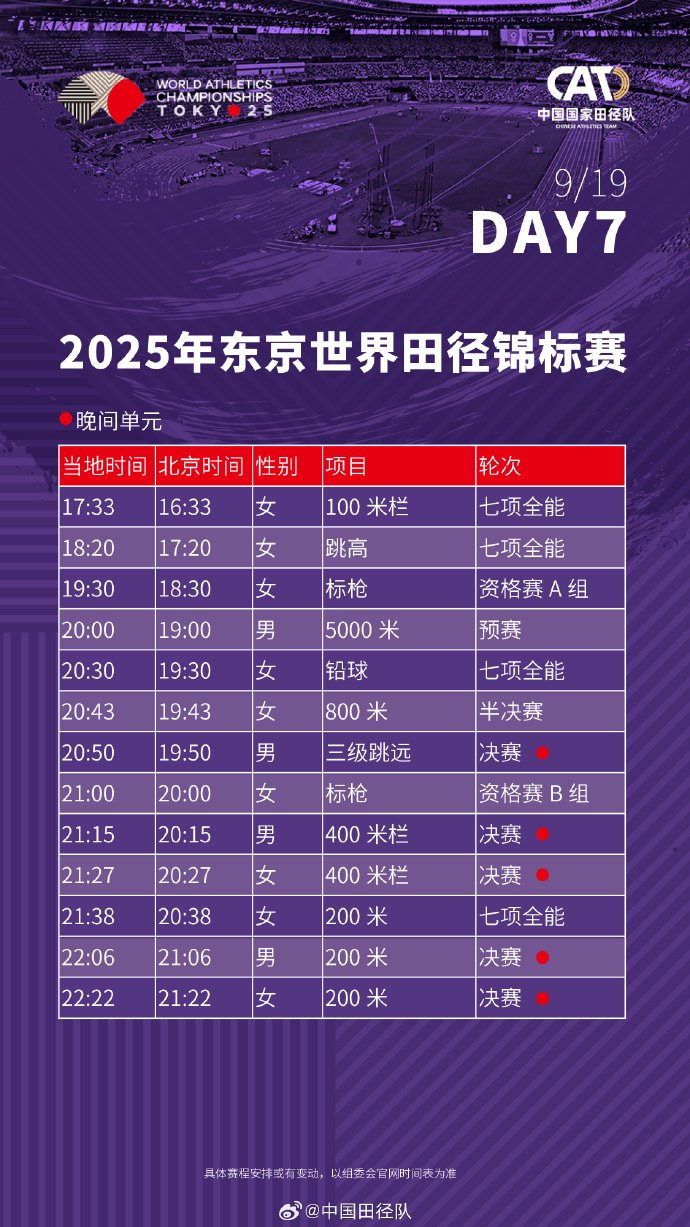 #2025东京田径世锦赛赛程# 中国田径队将派出73名运动员(男运动员41人、女运动员32人),参与田径世锦赛33个小项的比拼。
