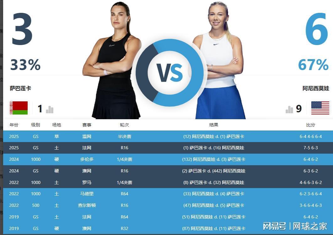 从两人过往的交手记纪录来看,萨巴伦卡以3胜6负处于明显下风。尤其在23年之前阿尼西莫娃是她的绝对大克星,尽管在蜕变之后拿到了宝贵的三场胜利,但两个月前的温网阿尼西莫娃以同样的蜕变之躯再次击败了萨巴伦卡,可见阿尼西莫娃借力快节奏的打法对萨巴伦卡的大引拍重力狂抡形成天然相克。值得一提的是,如果阿尼西莫娃本次决赛再次击败萨巴伦卡,那将完成对世界第一的“全满扫”,也是一份值得骄傲的成就。