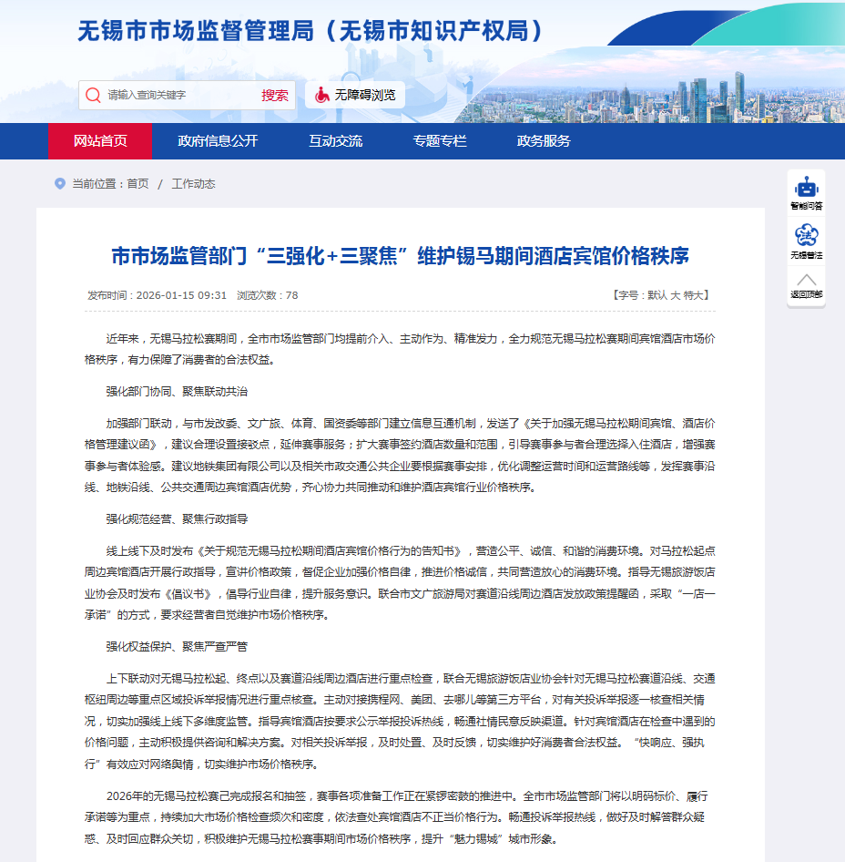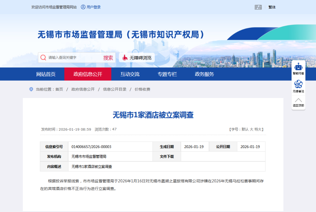 对于不严格遵守规定的无锡酒店,市场监管部门也迅速作出了回应。1月16日,无锡市市场监督管理对无锡市蠡湖之星旅馆有限公司涉嫌在2026年无锡马拉松赛事期间存在的宾馆酒店价格不正当行为进行立案调查。