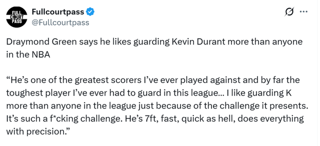 作为NBA历史顶级防守球员之一,格林很清楚,不可能赢下每一次对位。面对杜兰特时,这点尤为明显。