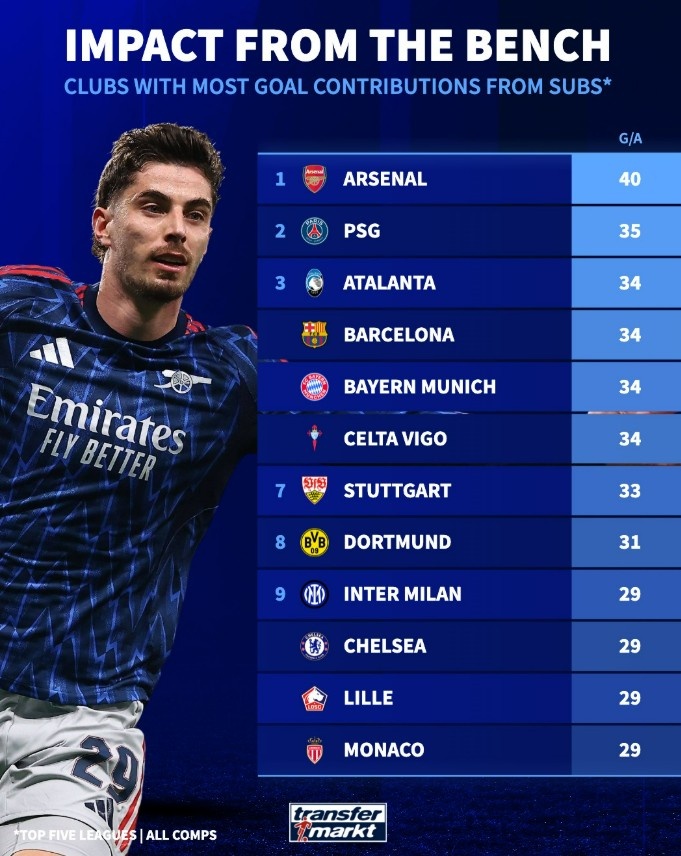 爱游戏中国官网-本赛季五大联赛球队替补参与进球榜:阿森纳40球领跑,巴黎次席