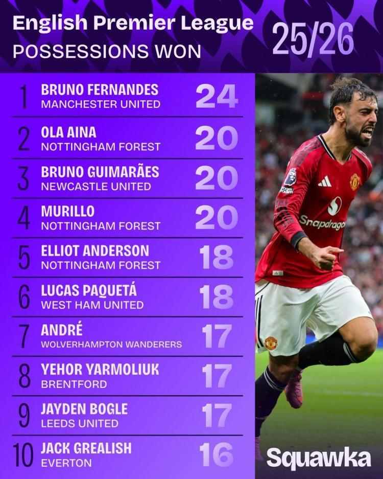 直播吧9月3日讯 数据机构squakwa统计了新赛季英超球员赢得球权情况,B费独自领跑。